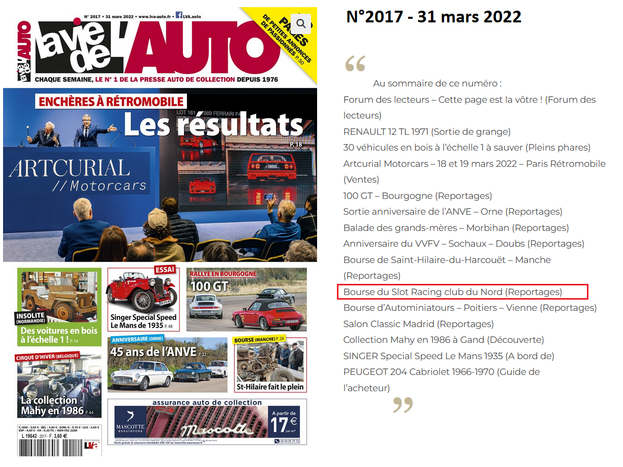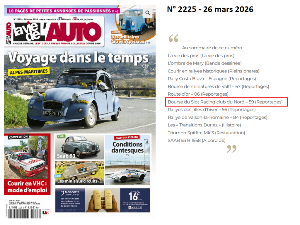Après un premier article paru dans le numéro 2017 du 31 mars 2022 du magazine La Vie de l’auto, l’association Slot Racing Club du Nord se voit une fois de plus mise en lumière dans le cadre de la trentième édition de sa convention internationale de voitures de circuits routiers électriques (La cinquième à Sebourg) qui s’est déroulée en mars 2026.